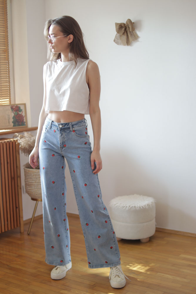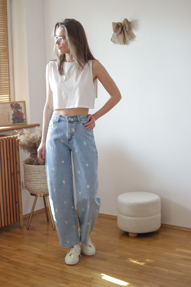 Mam na sobie rozmiar S (najczęściej w jeansach noszę XS) – polecam sprawdzić wymiary poniżej, rozmiarówka jest trochę zaniżona (S to bardziej XS, S to bardziej M itd)