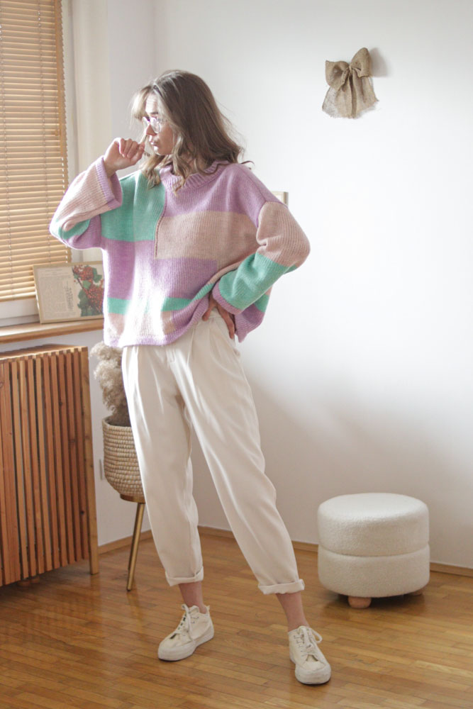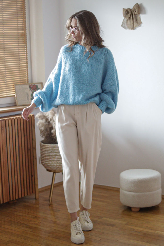 Swetry są bardzo szerokie – jest to mocny oversize, nie polecam dla osób preferujących bardziej dopasowane kroje.
