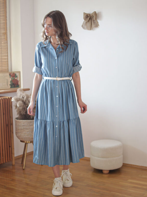 Przez regulację dekoltu można ustawić sukienkę tak, że pomieści brzuszki ciążowe – widoczne na kilku zdjęciach wersji baby blue.