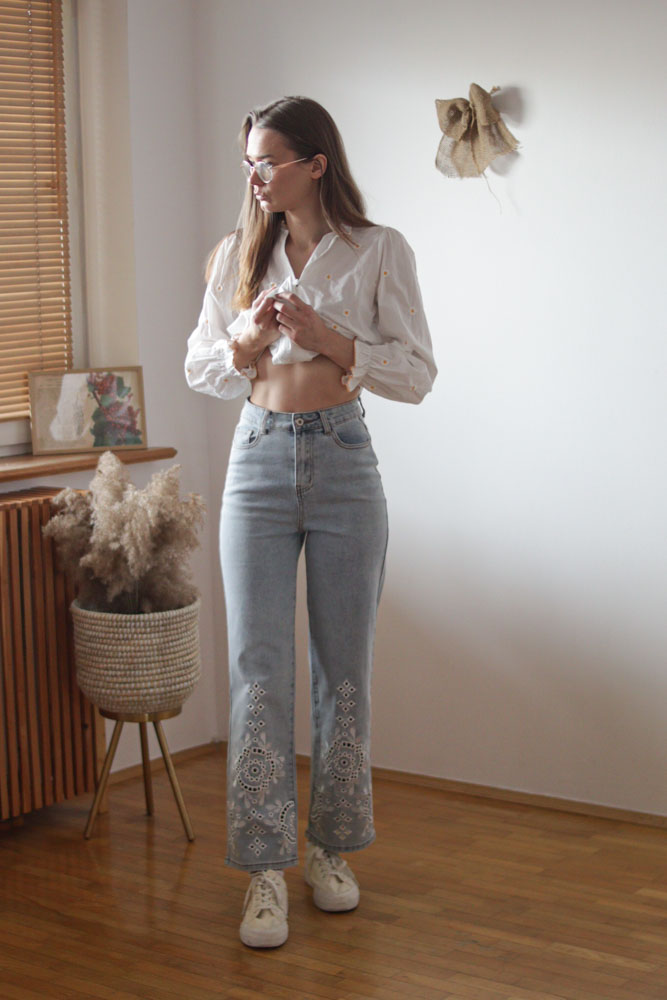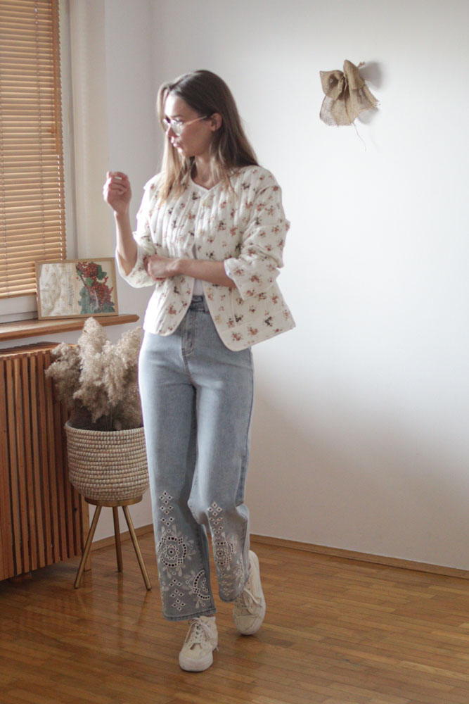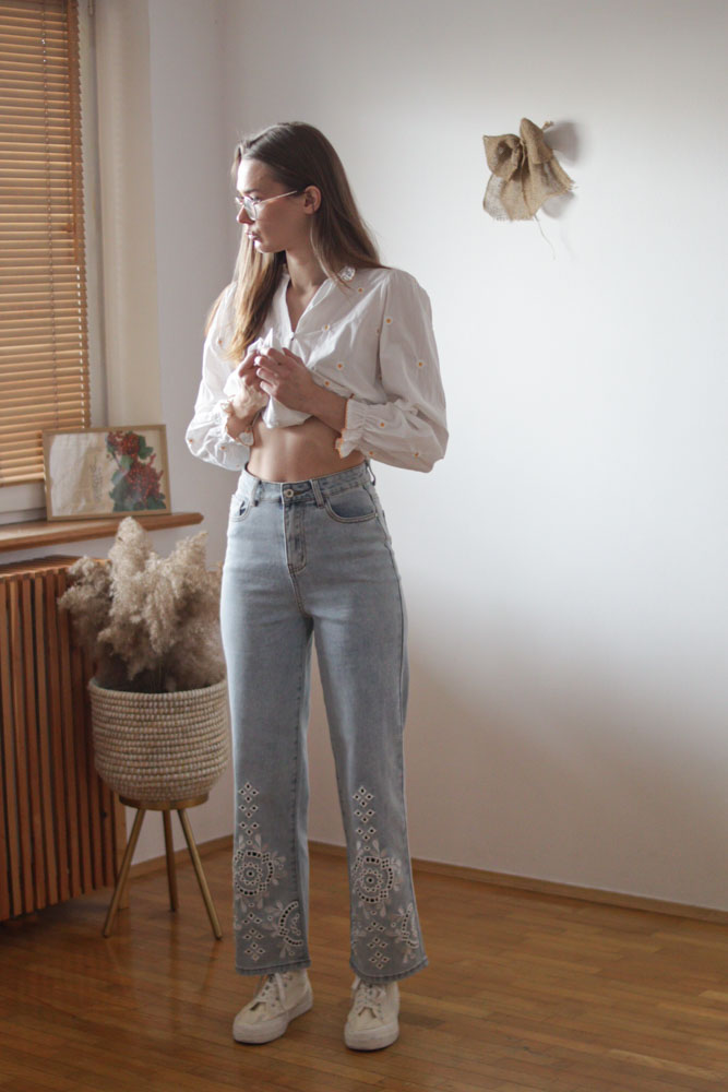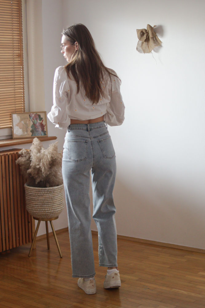 Mam na sobie rozmiar S (najczęściej w jeansach noszę XS) – polecam sprawdzić wymiary poniżej, rozmiarówka jest trochę zaniżona (S to bardziej XS, S to bardziej M itd)