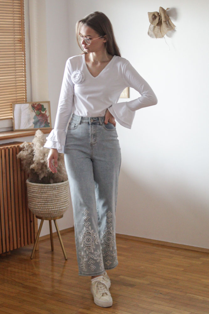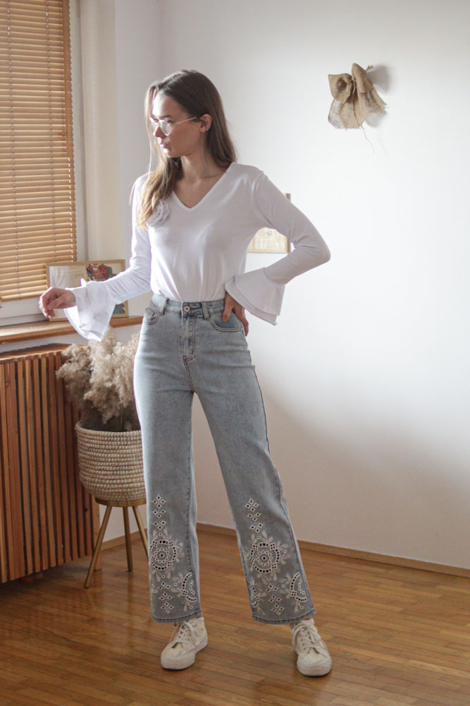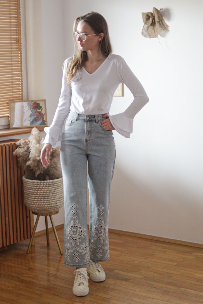 Dół nogawek zdobi ażurowe wykończenie z dekoracyjnymi otworami.