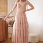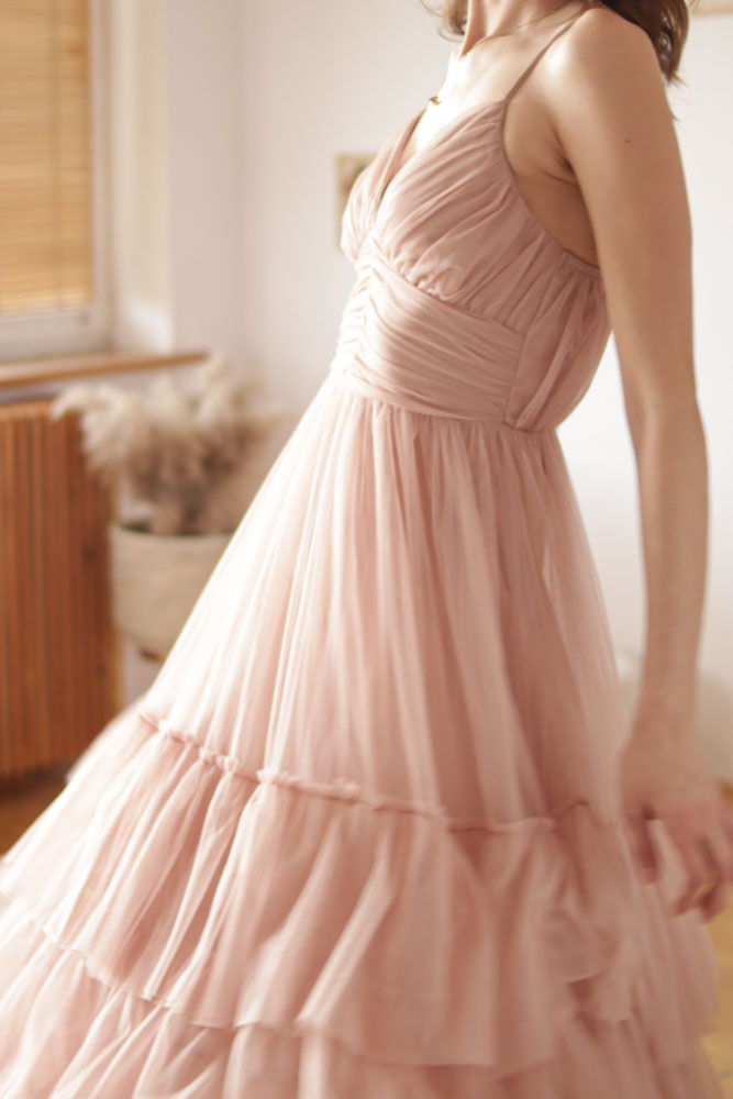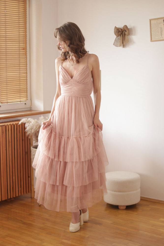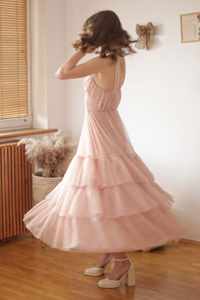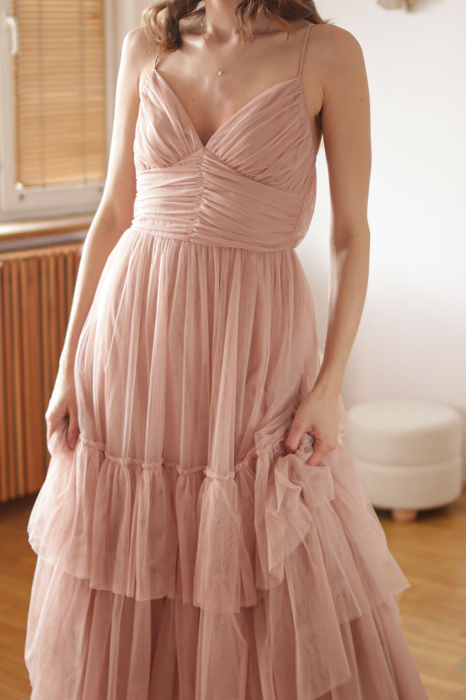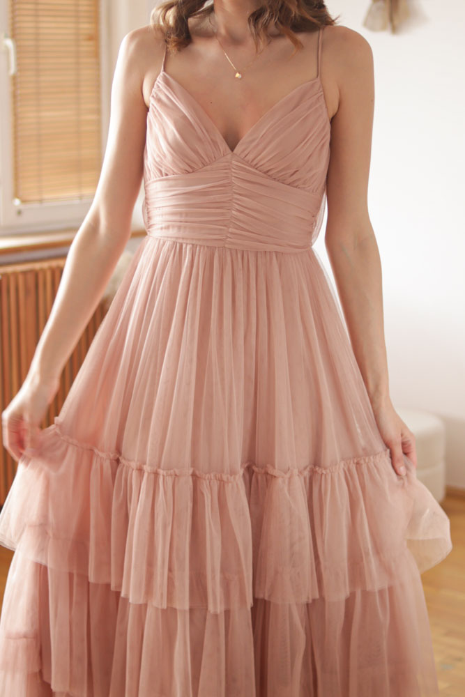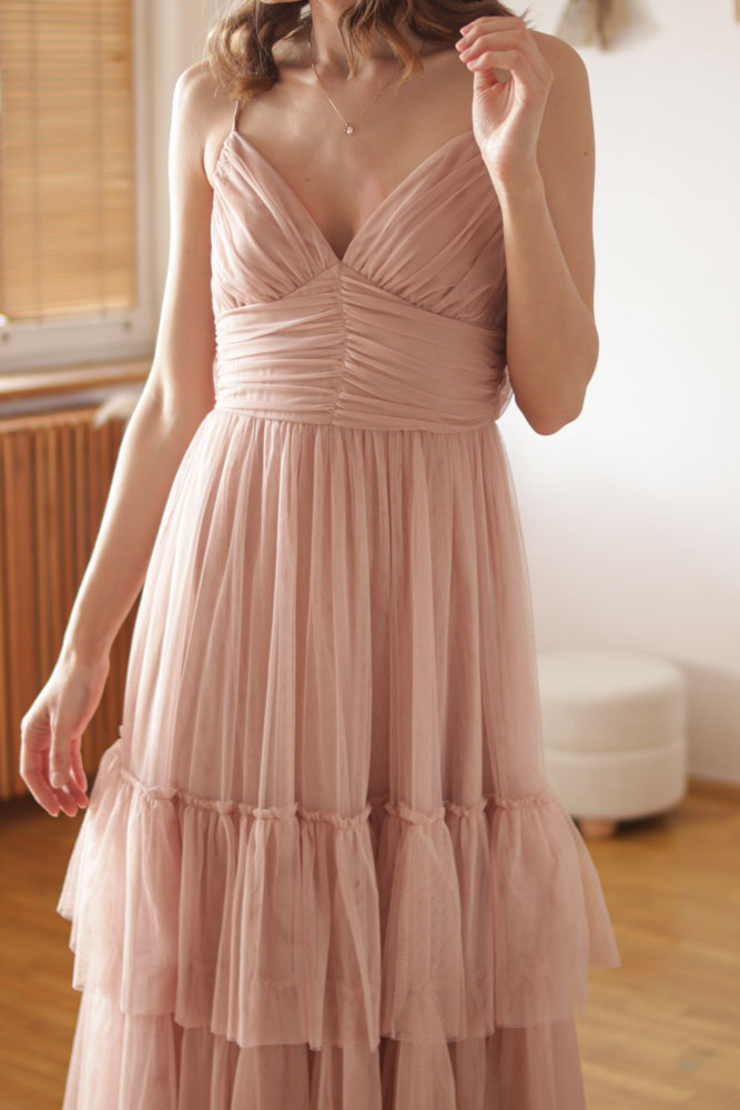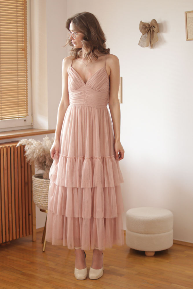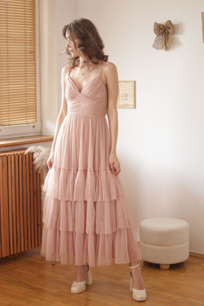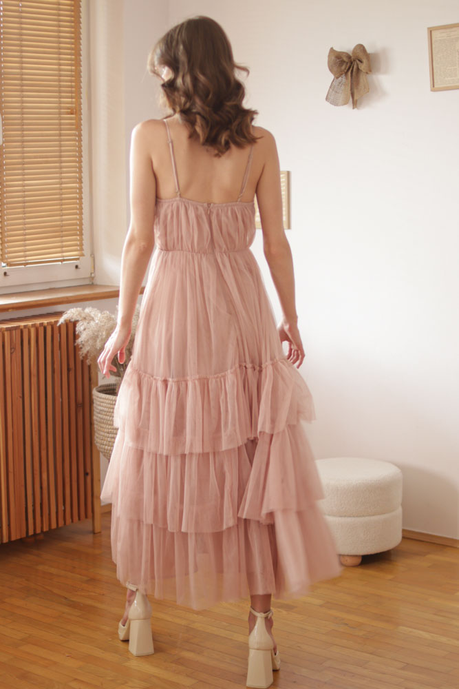 Canna – tiulowa sukienka maxi z regulowanymi ramiączkami i falbanami na dole