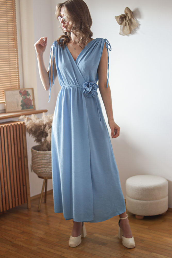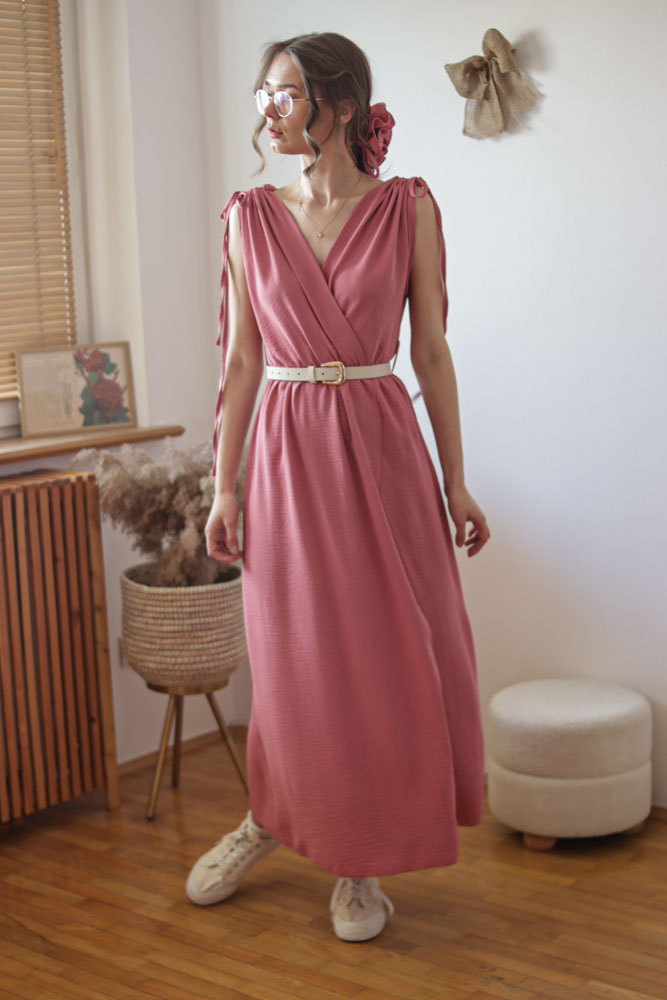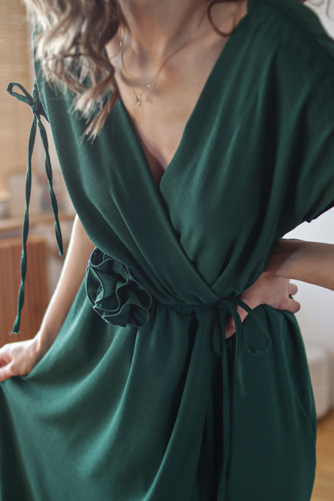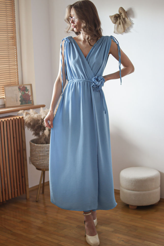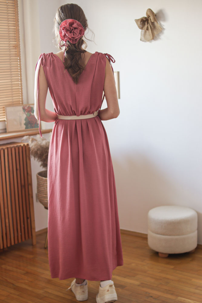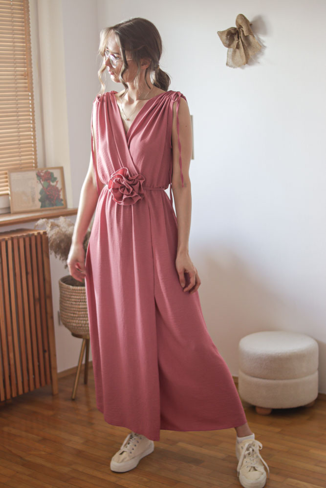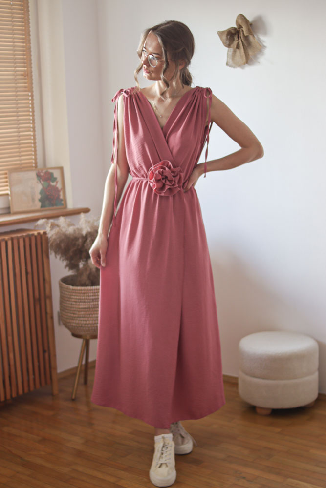 NewSukienki mają gumkę w talii/pod biustem + pasek – materiałowy „sznurek” z różą.