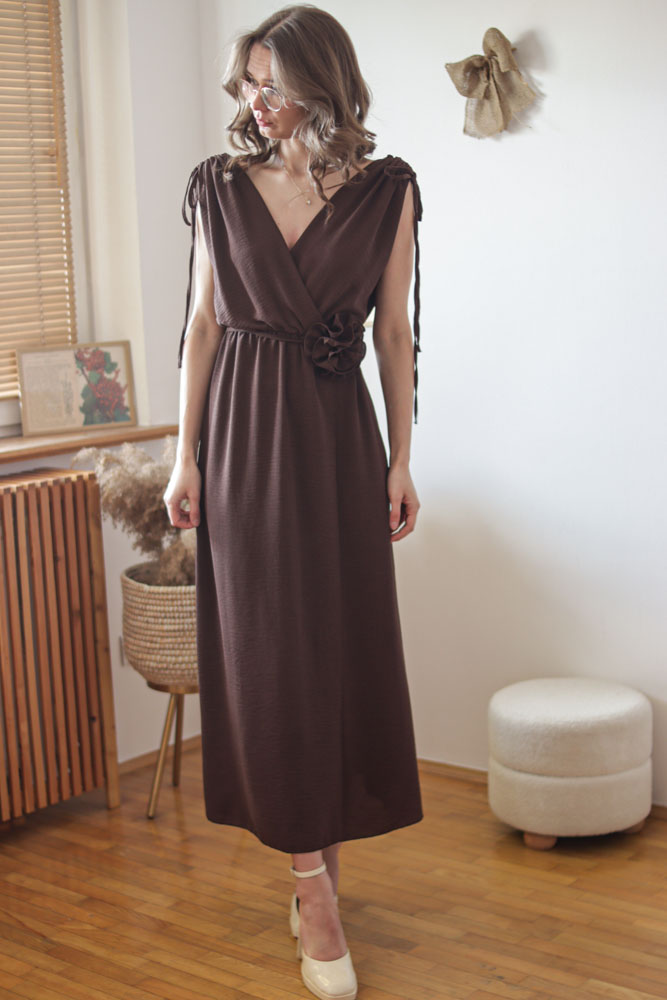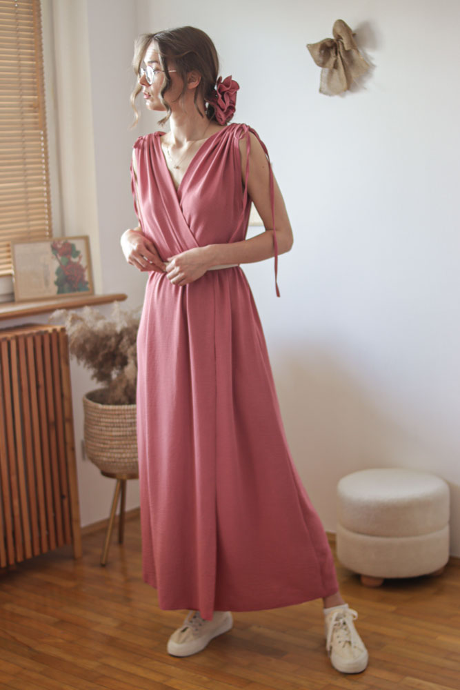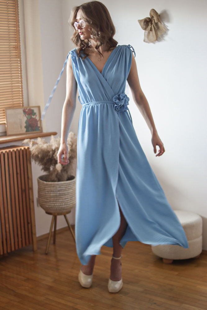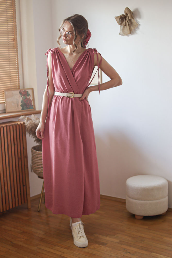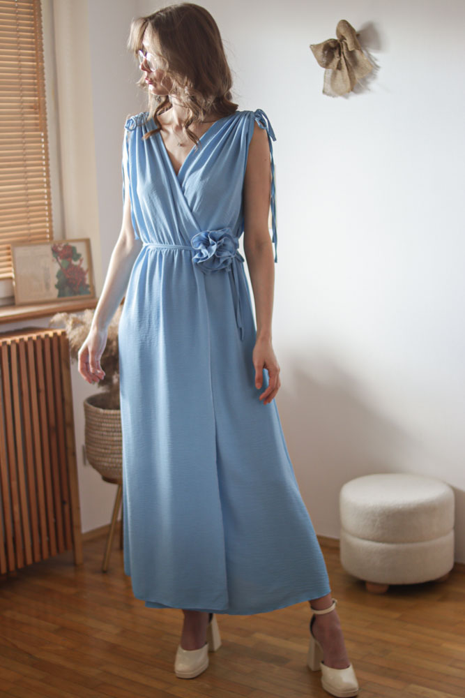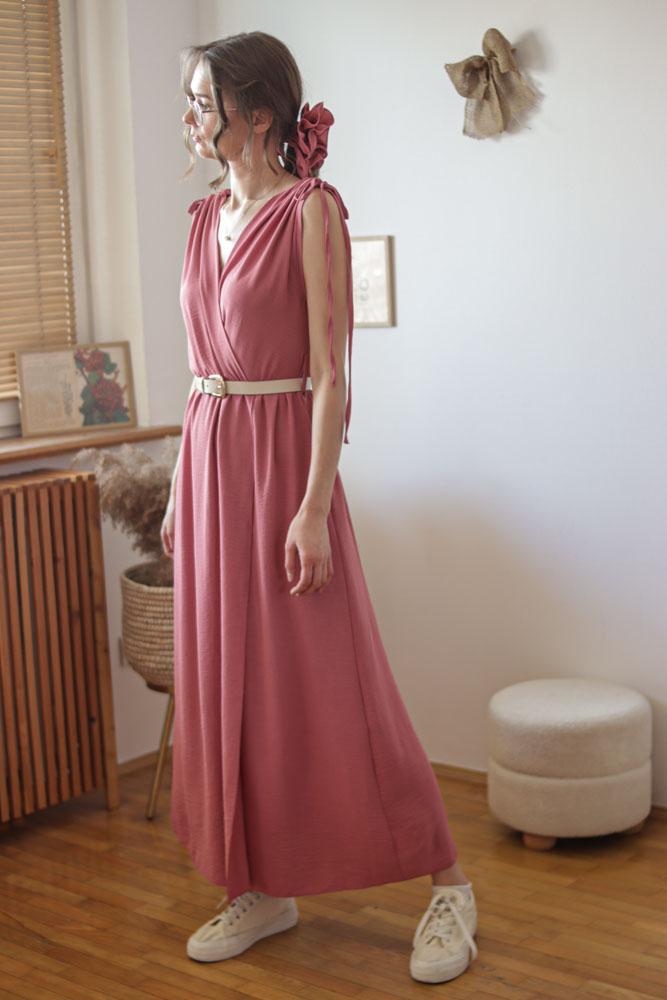 NewSukienki mają gumkę w talii/pod biustem + pasek – materiałowy „sznurek” z różą.