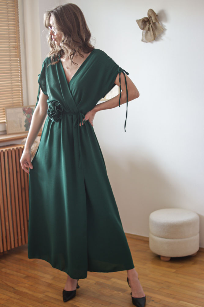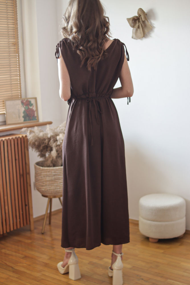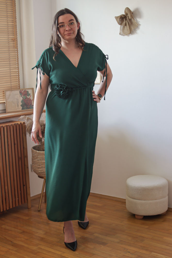 Część spódnicowa jest szyta na zakładkę z przodu – ma głębokie rozcięcie, jednak przy chodzeniu nie rozchodzi się mocno.