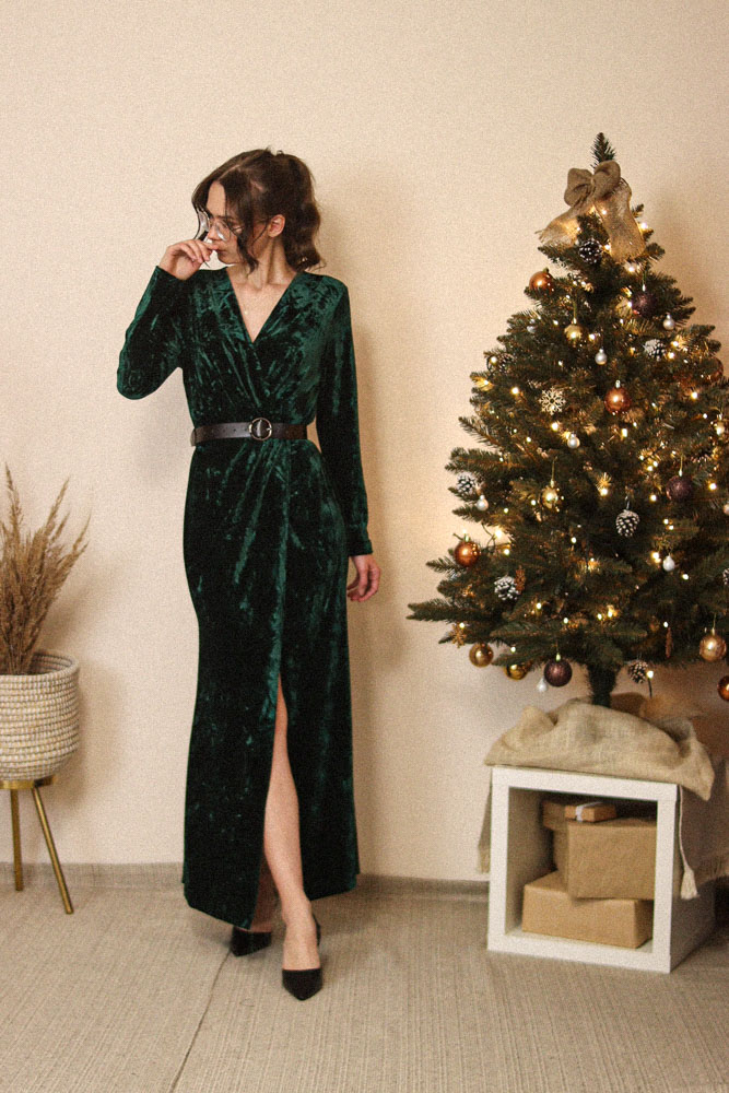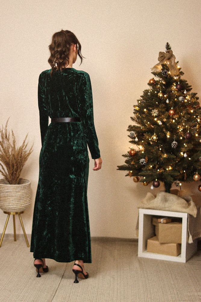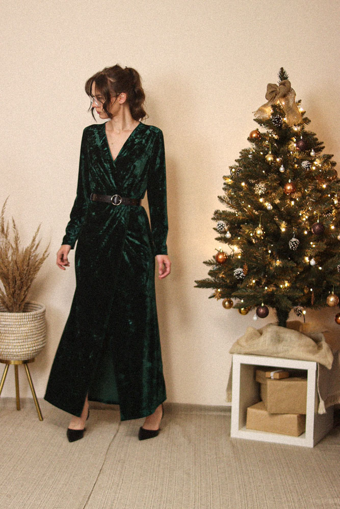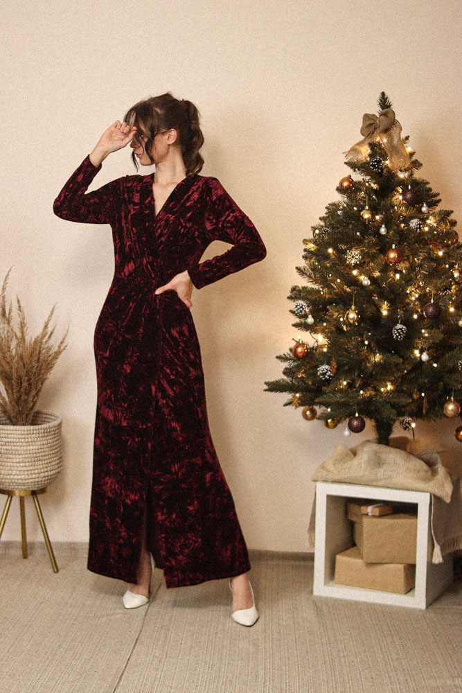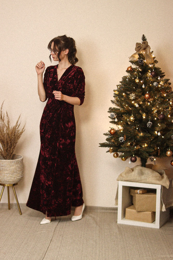 Sukienka jest bardzo długa – modelka na zdjęciach ma 174cm wzrostu plus obcas – dokładne wymiary (w tym długość całkowita) poniżej.