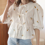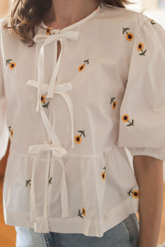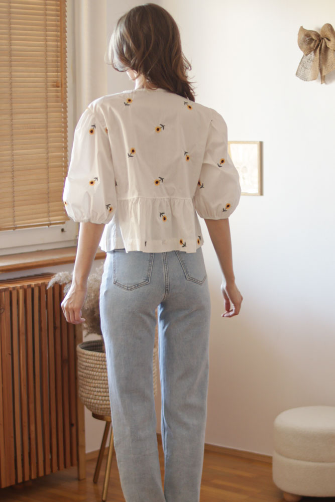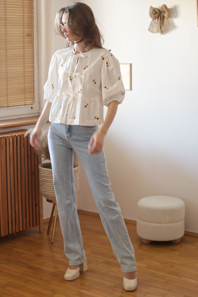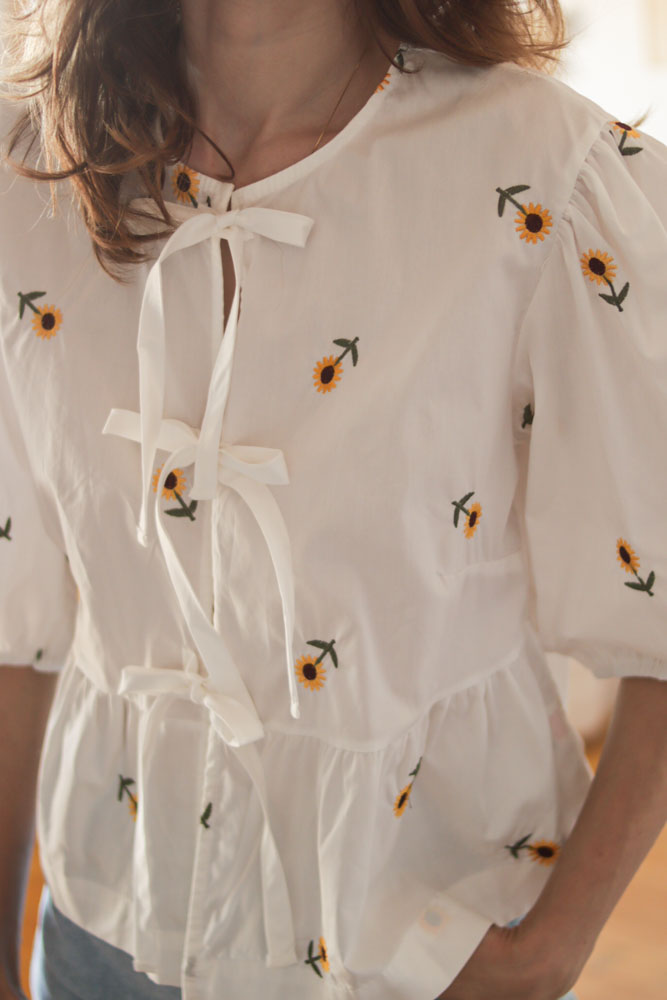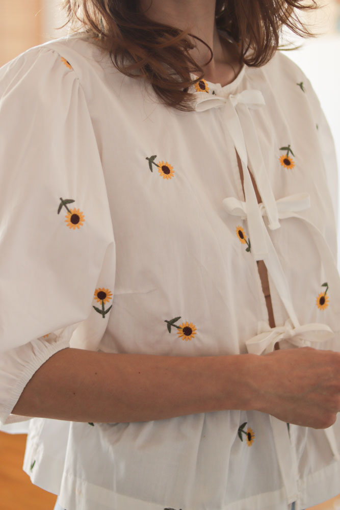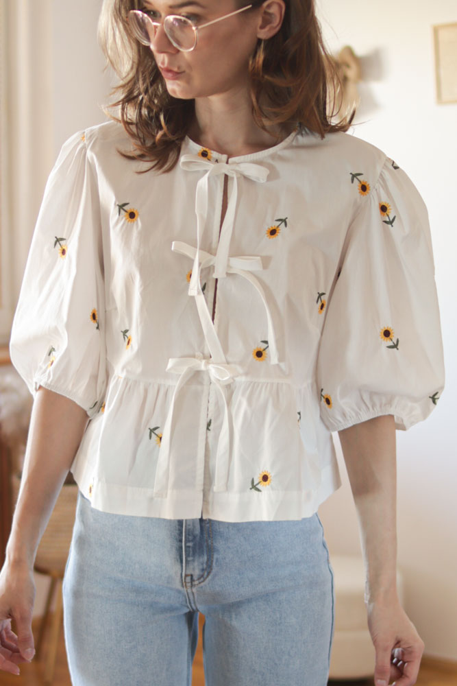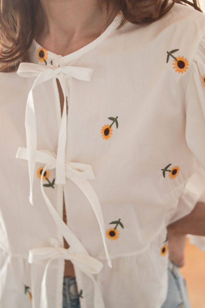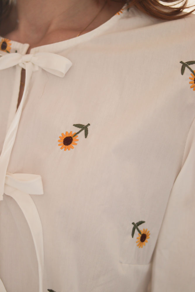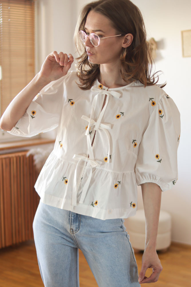Rudbeckia – biała koszula wiązana z przodu w haftowane słoneczniki