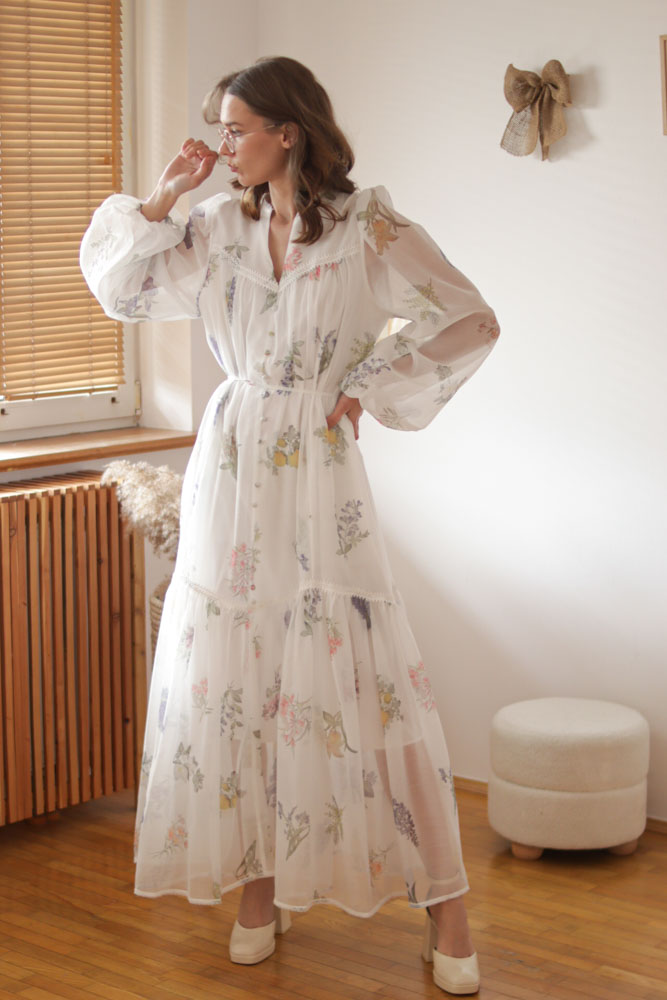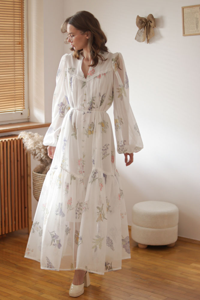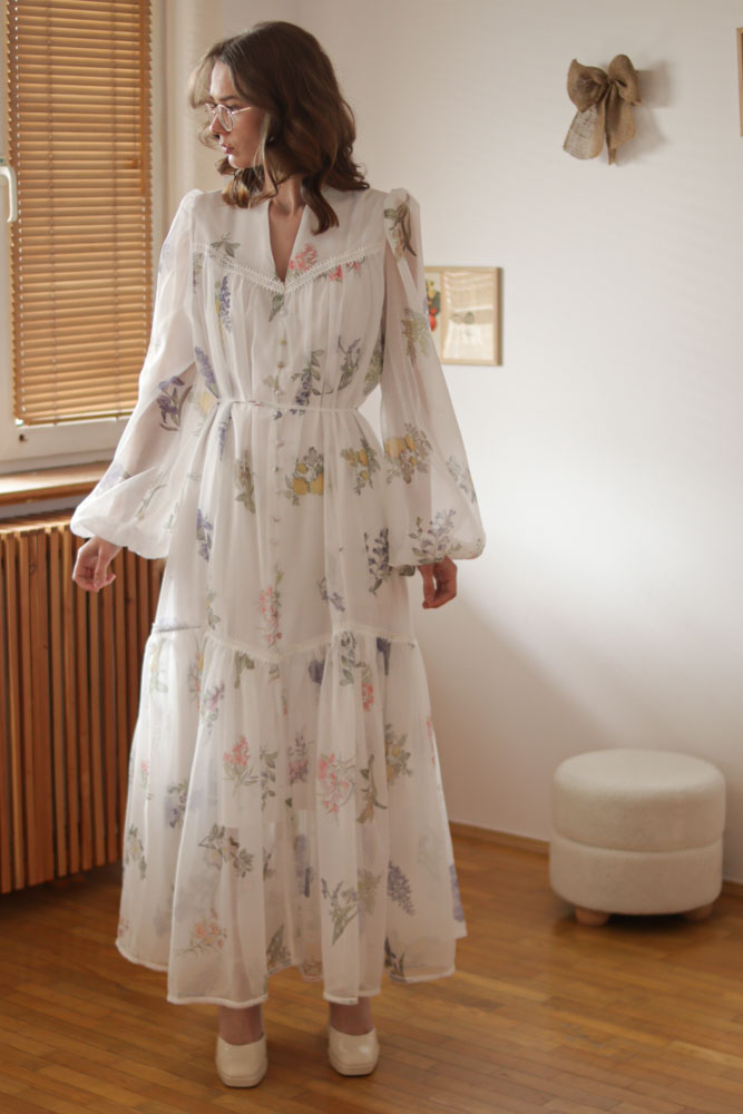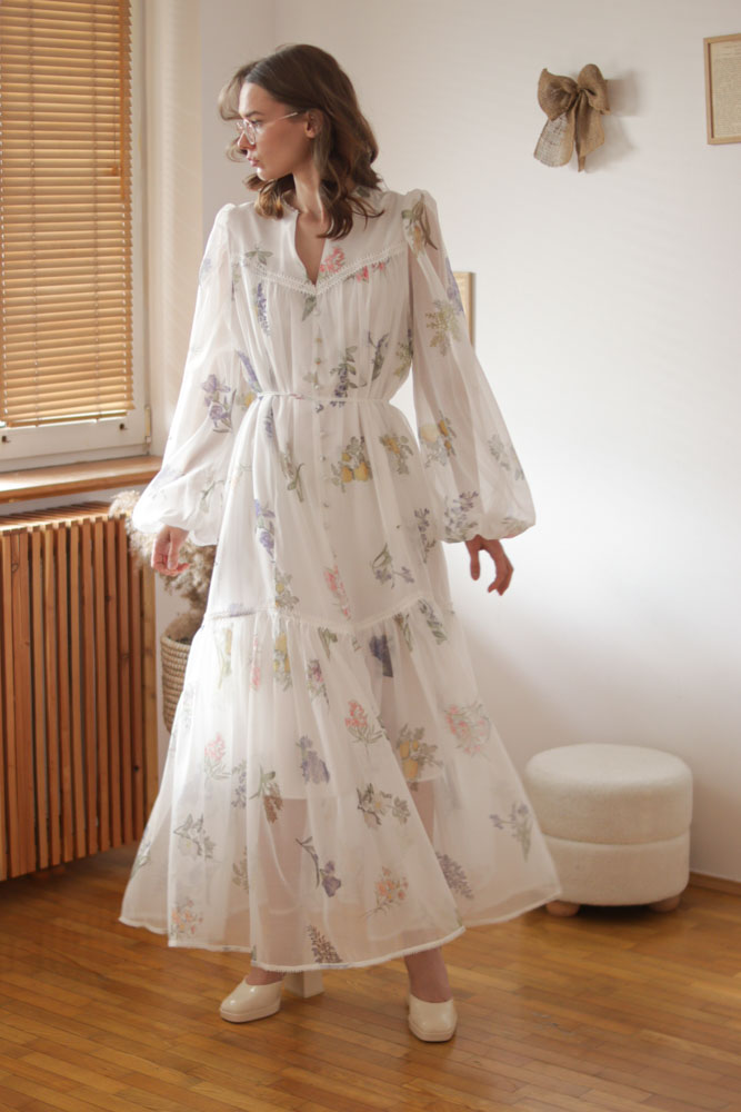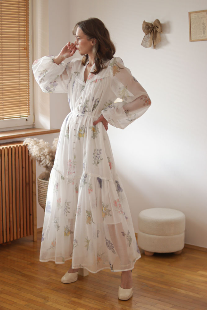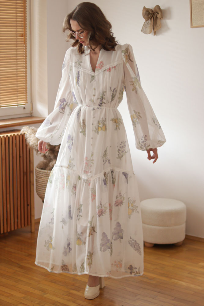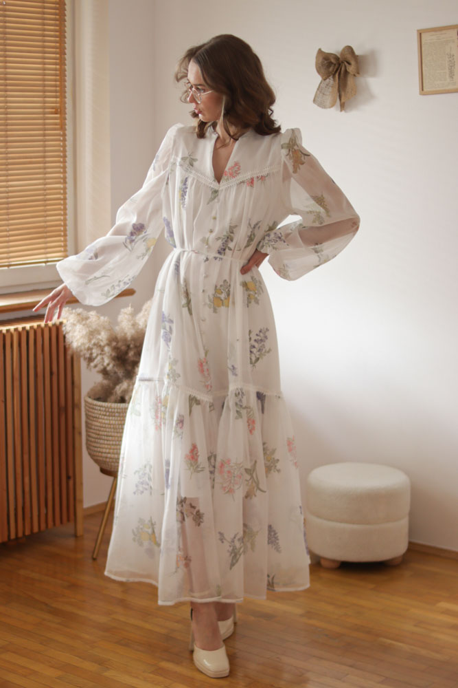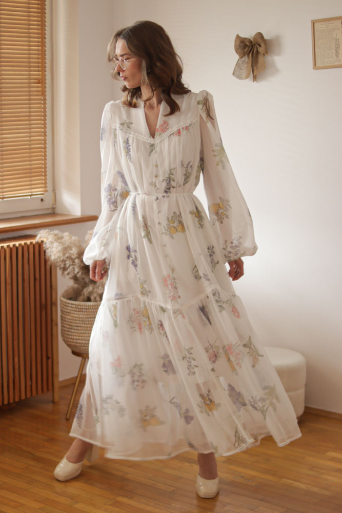 Sambucus – szyfonowa, długa, biała sukienka w kwiaty