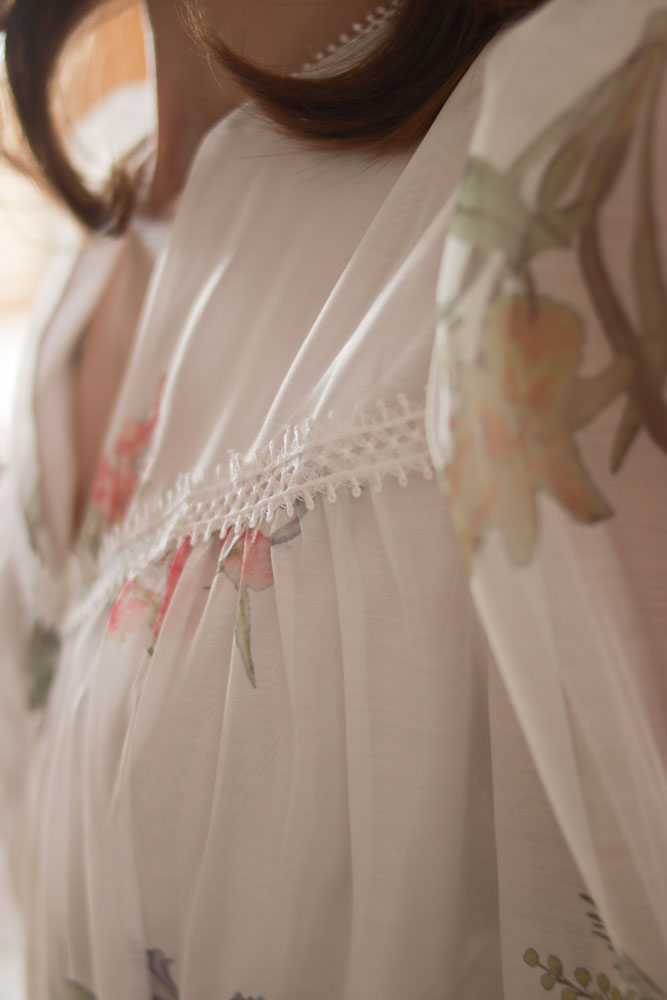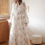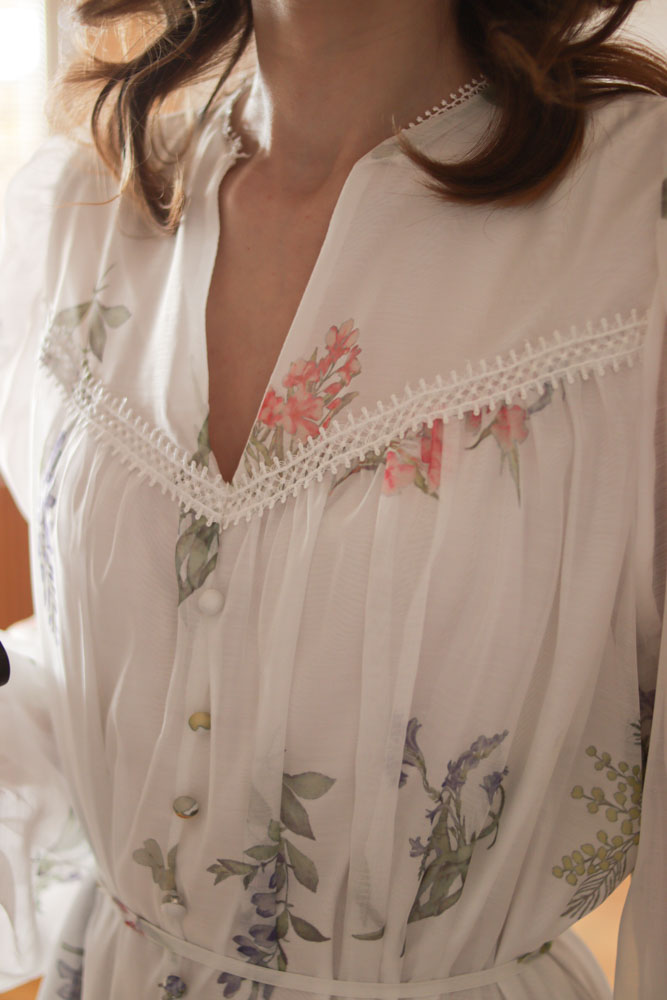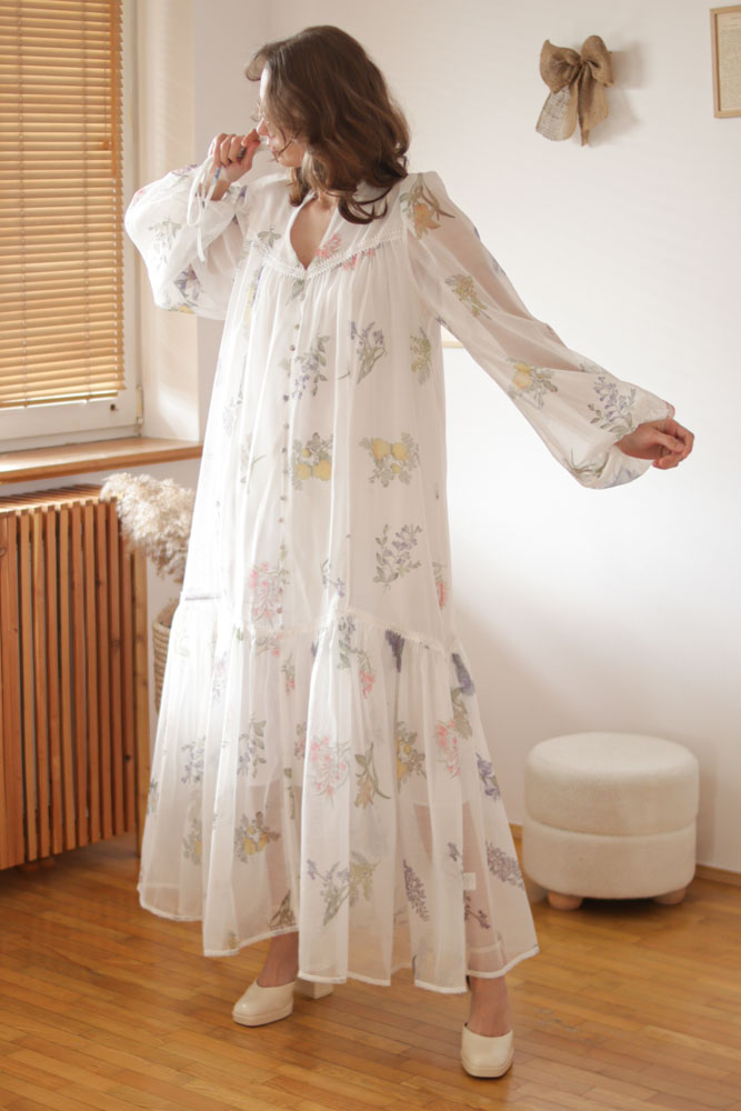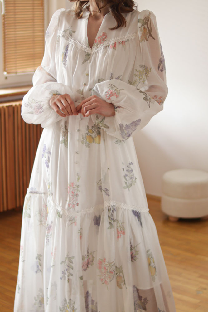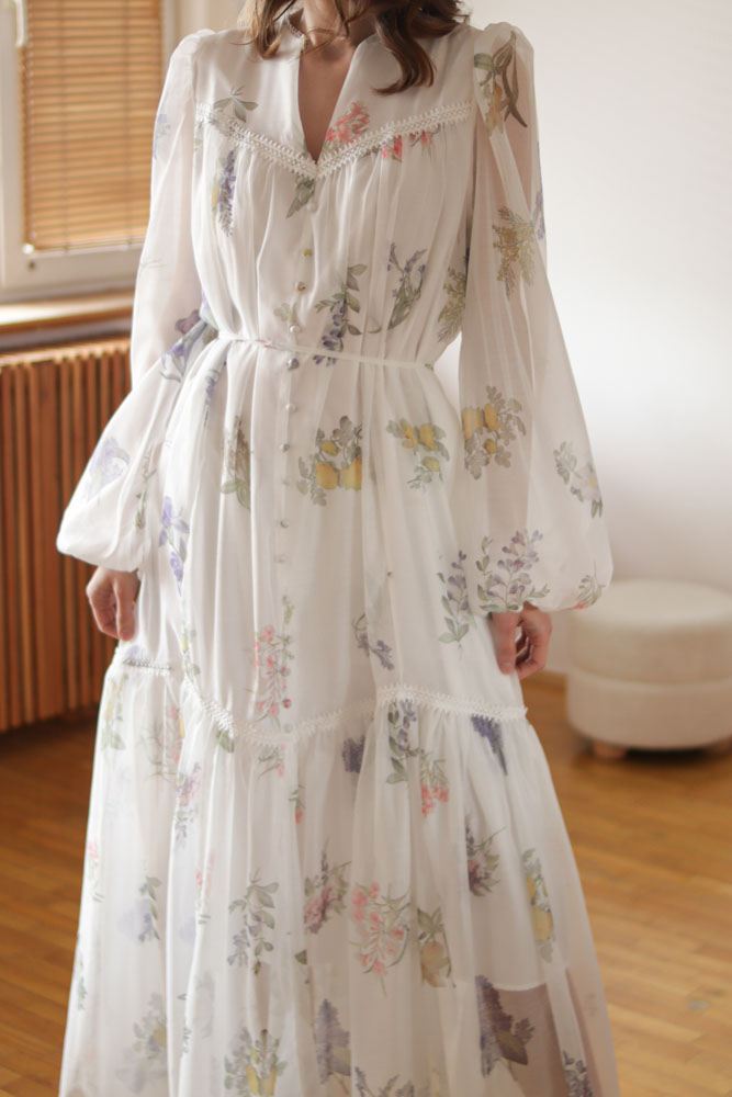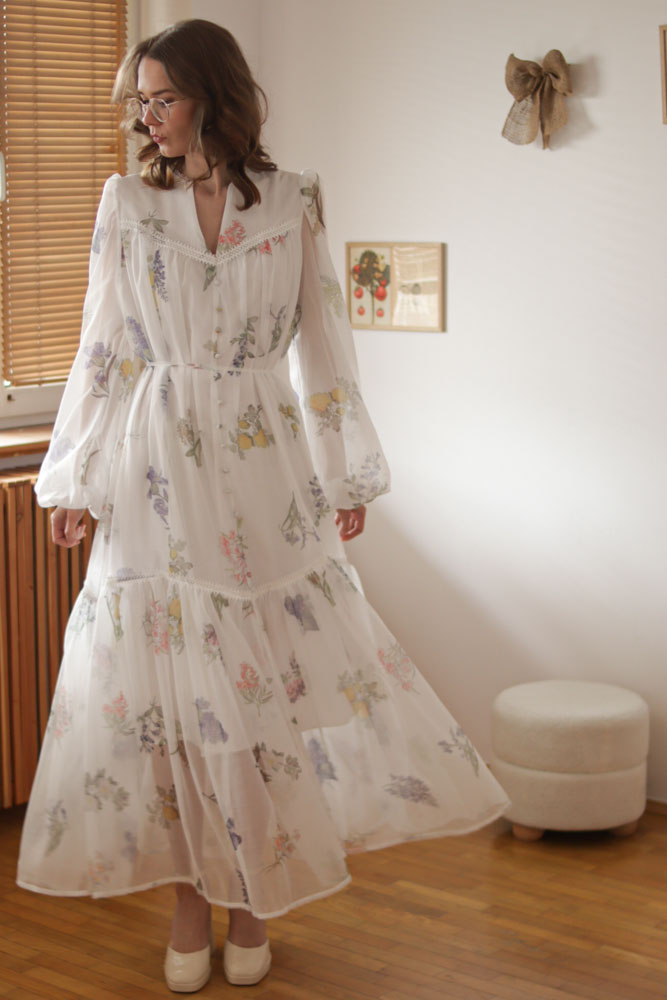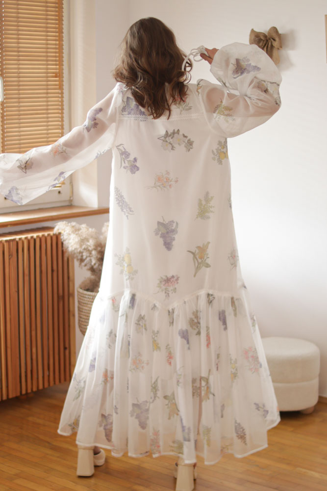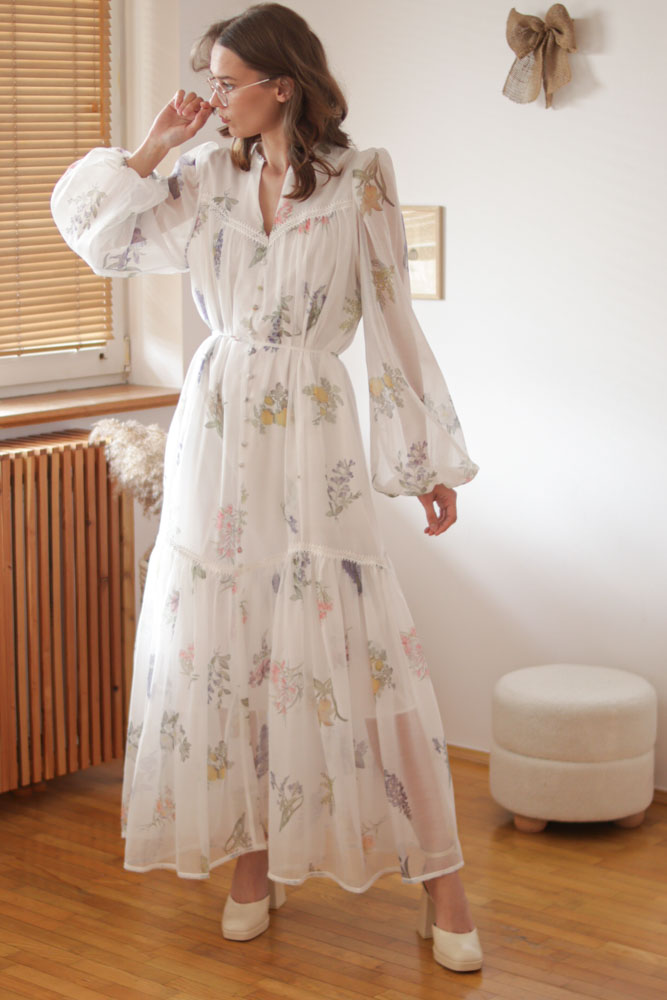 Sambucus – szyfonowa, długa, biała sukienka w kwiaty